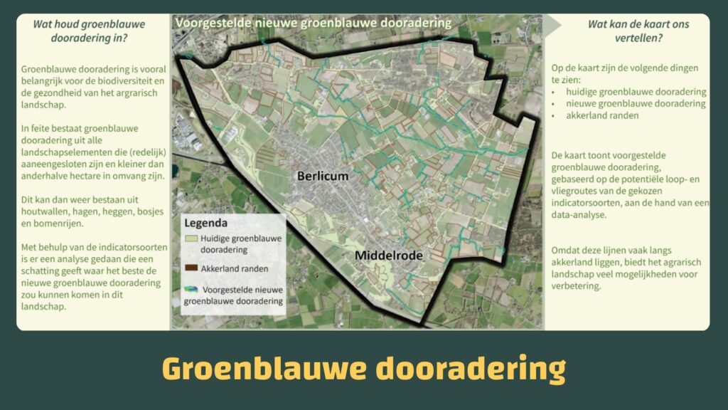 In het kader van een tweedejaarsproject hebben studenten van de HAS Green Academy onderzoek gedaan naar de versterking van de zogenoemde groenblauwe dooradering van het landschap rondom Berlicum en Middelrode. Met groenblauwe dooradering bedoelen we alle kleine landschapselementen die met elkaar verbonden zijn, zoals houtwallen, hagen, bosjes en bomenrijen. Deze structuren zijn van groot belang voor de biodiversiteit. De studenten hebben een uitgebreide analyse gemaakt en een kaart opgesteld met bestaande én mogelijke nieuwe landschapselementen. We gaan bekijken hoe we deze inzichten kunnen gebruiken bij de verdere invulling van het nieuwe groenbeleid van de gemeente.