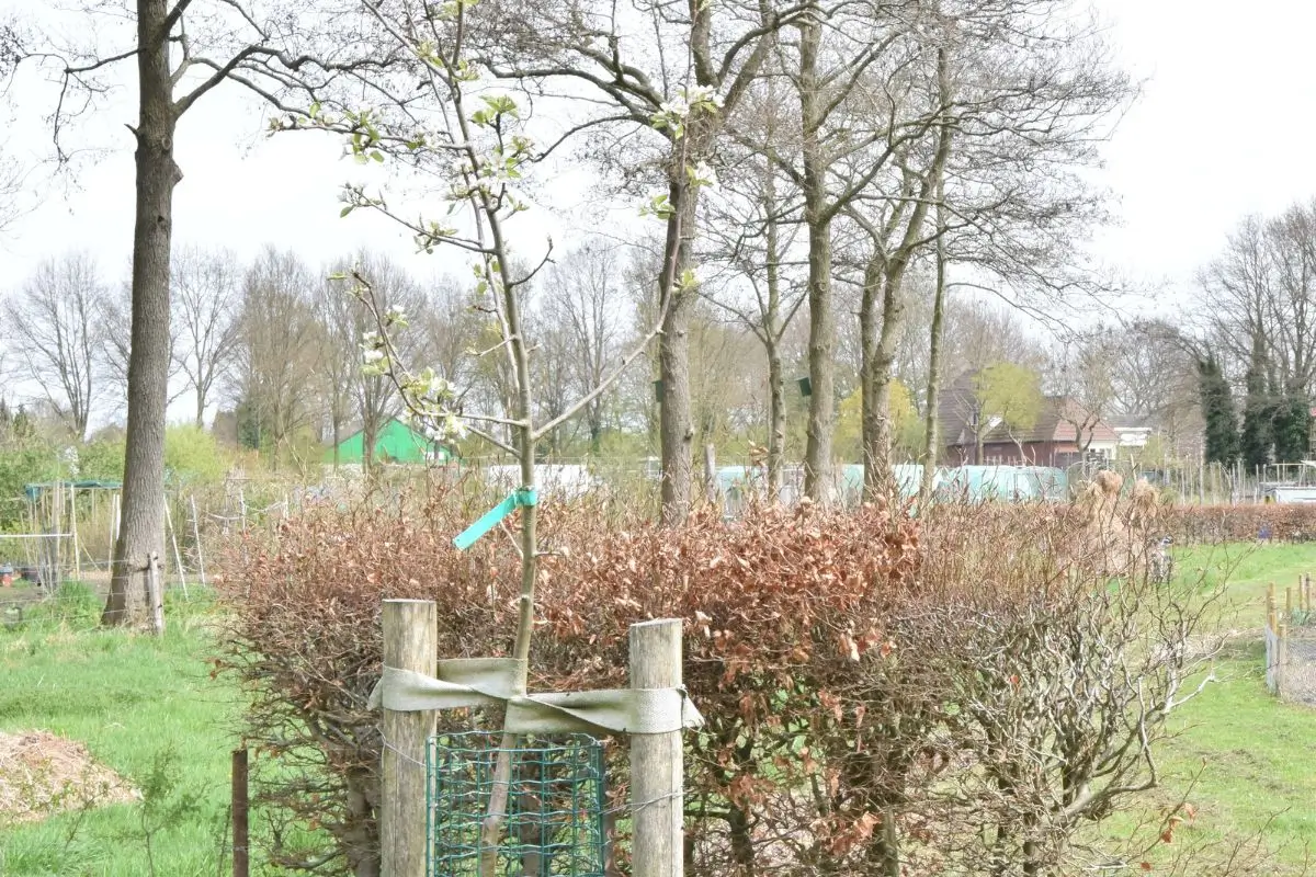 De boomgaard eigendom is van de volkstuinvereniging en het fruit wordt verdeeld onder de leden.